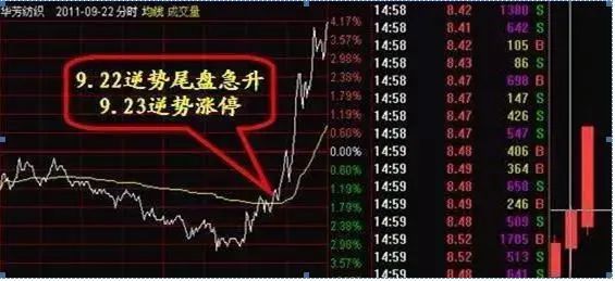 这个比较容易识别,尾盘放量迅速拉升,越是逆势拉升越是放量拉升,代表着进场资金越多后市拉高的幅度更大。一定要放量的,总成交量不大的,极有可能是主力出货。
