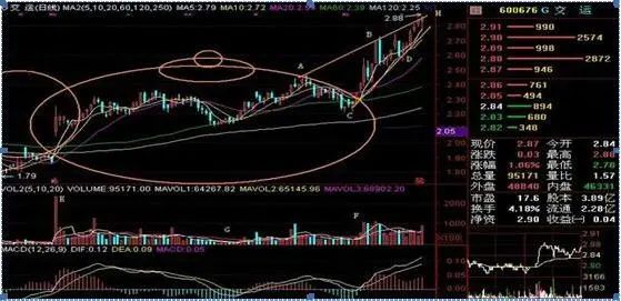 (图1)E点是股改缺口,当天换手16.95%,涨16.36%,明显有资金介入,以后连续放量,股价温和爬高,这也是收集筹码的迹象。G点是洗盘到“量芝麻点”的形态,庄家基本上把浮动筹码赶尽杀绝了。这时,股价跌到60平均线附近,这是比较标准的止跌位。如果是强势洗盘,止跌位会远离60线,而弱势洗盘,止跌位会切入60线。从G点至F点又是一次收集筹码和震仓洗盘,至此,庄家把筹码吃得饱饱的,肚子像这茶壶肚子,装满了茶水。从A高点至B高点是高点连线,也是拉高股价的斜率,C点至D点是低点连线,这两条线像茶壶的嘴,里面装满上升楔形内的所有K线。现在我们设想,茶壶里的茶被煮沸后,会往哪个方向喷去?你也可想象,庄家一发力,股价会往哪个方向喷去?显而易见,只能加速上升,所有庄股都一个样,收集筹码放在肚子里,悄然推高股价是茶壶嘴,一旦喷出,连拉涨停,散户追涨,蒸气消失。壶还是那个壶,嘴还是那个嘴,气还是那个气,追还是那个追。